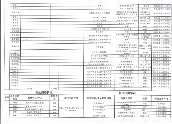 芙蓉区慈善会为进一步完善工作,化解廉政风险,根据相关法律法规以及《关于进一步规范涉疫捐赠款物有关工作的建议函》(芙纪函〔2020〕1号)、《关于进一步规范涉疫捐赠款物有关工作的通知》(芙疫防指发〔2020〕6号)文件精神,现对区隆平高科技园、湘湖管理局、各街道办事处、区直各相关单位涉疫捐赠款物有关工作进行统一汇总公示。