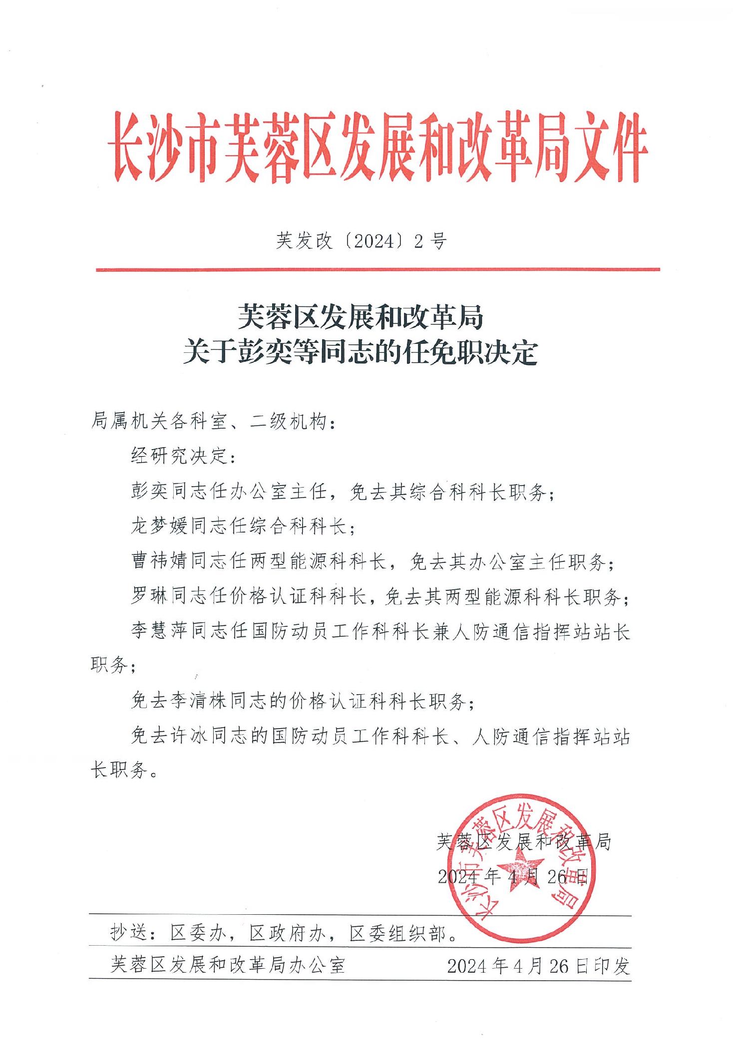关于彭奕等同志的任免职决定