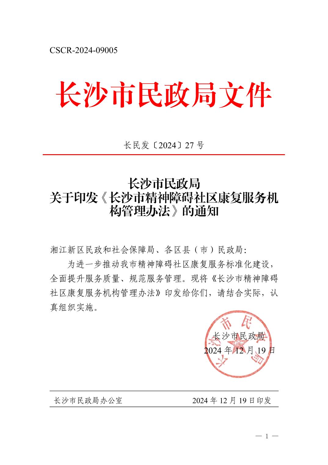 长沙市民政局关于印发《长沙市精神障碍社区康复服务机构管理办法》的通知