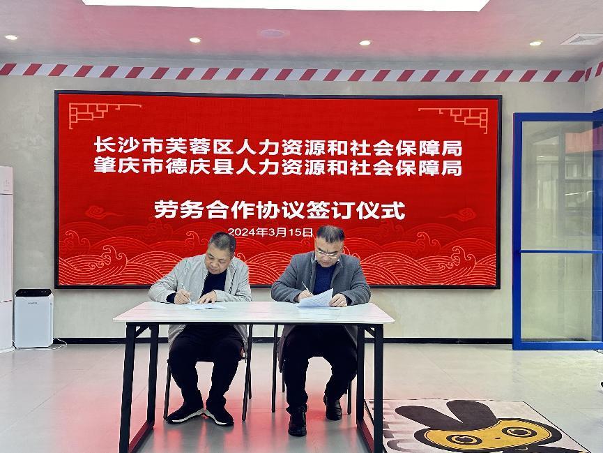 调研座谈会上,芙蓉区人社局、德庆县人社局相关负责人共同签订了“芙蓉区-德庆县劳务合作协议”。双方表示,要坚持优势互补、互惠共赢、示范引领原则,深入探索建立人才引育对接机制、重点领域人才交流机制,进一步加深芙蓉区、德庆县交流合作,全力助推两地高质量发展。
