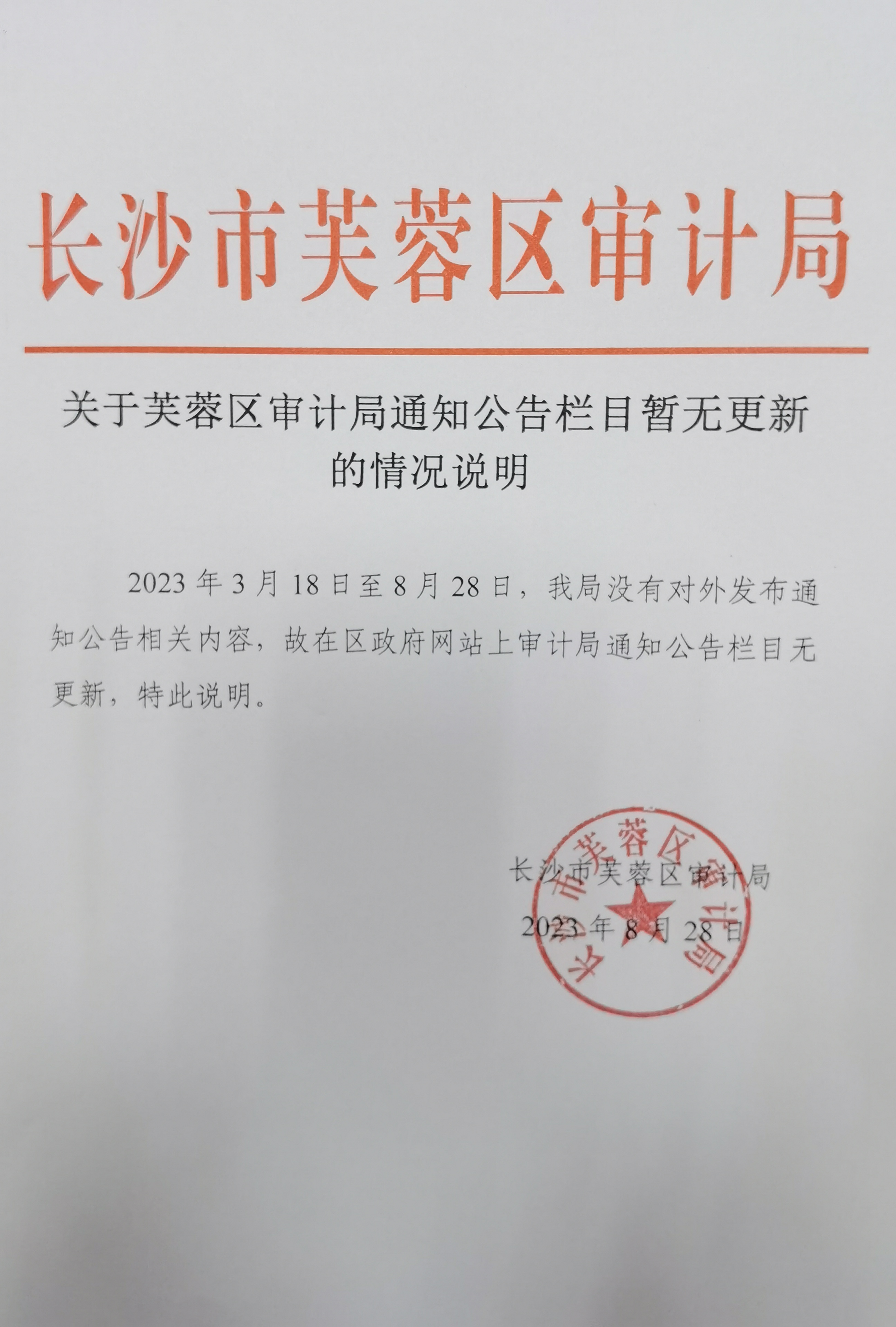 关于芙蓉区审计局通知公告栏目暂无更新的情况说明
