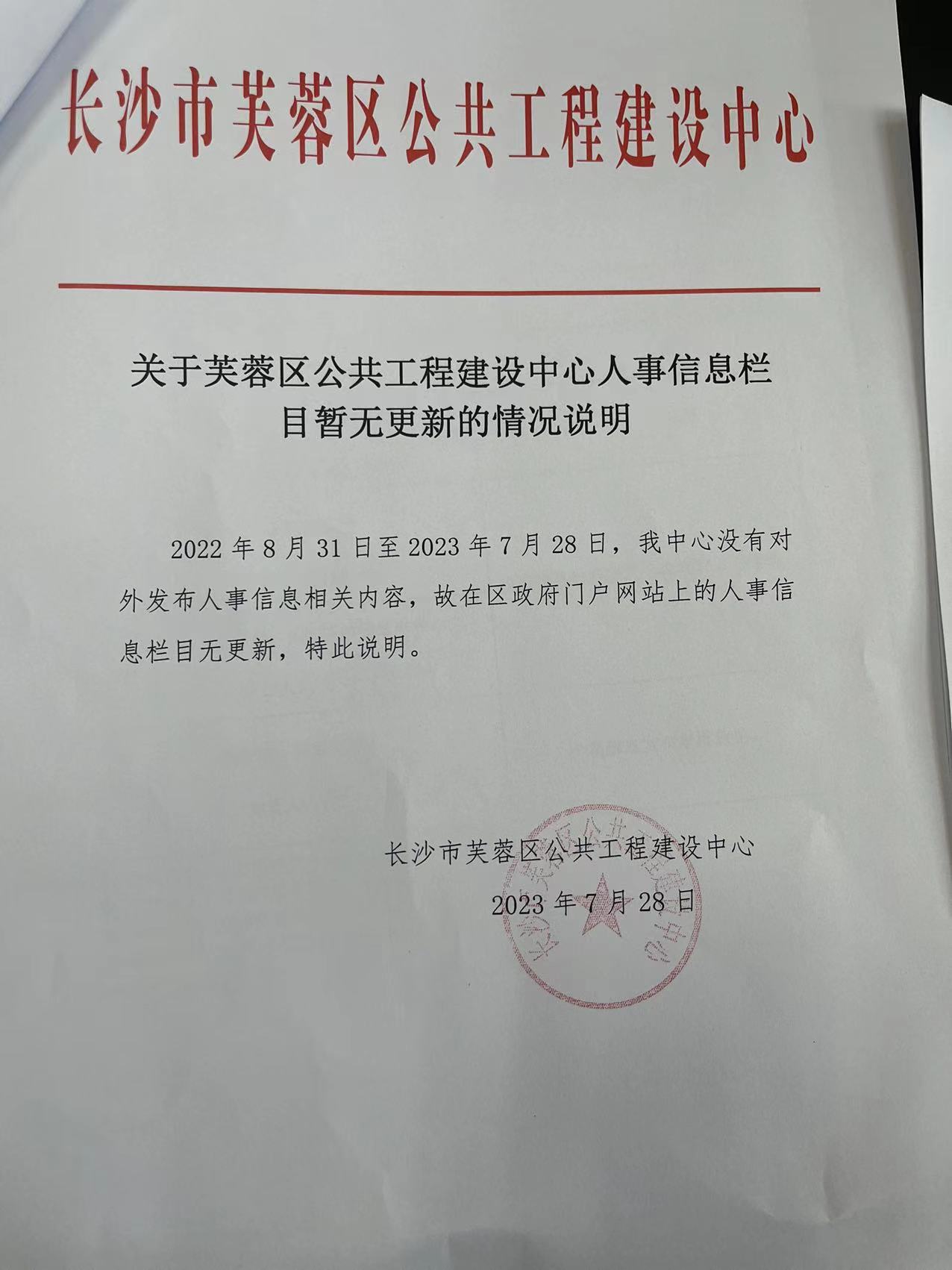 关于芙蓉区公共工程建设中心人事信息栏目暂无更新的情况说明