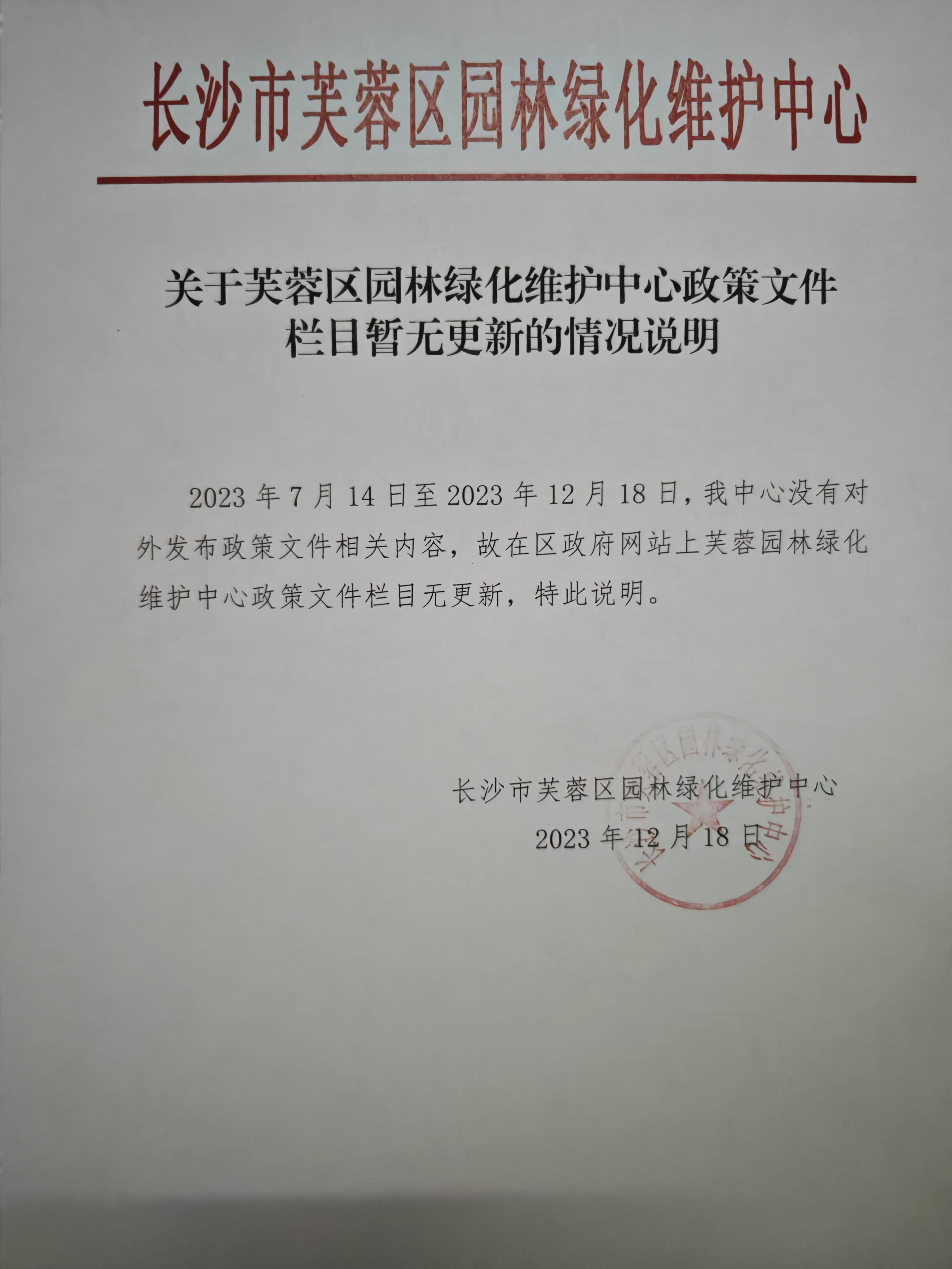 关于芙蓉区园林绿化维护中心政策文件栏目暂无更新的情况说明
