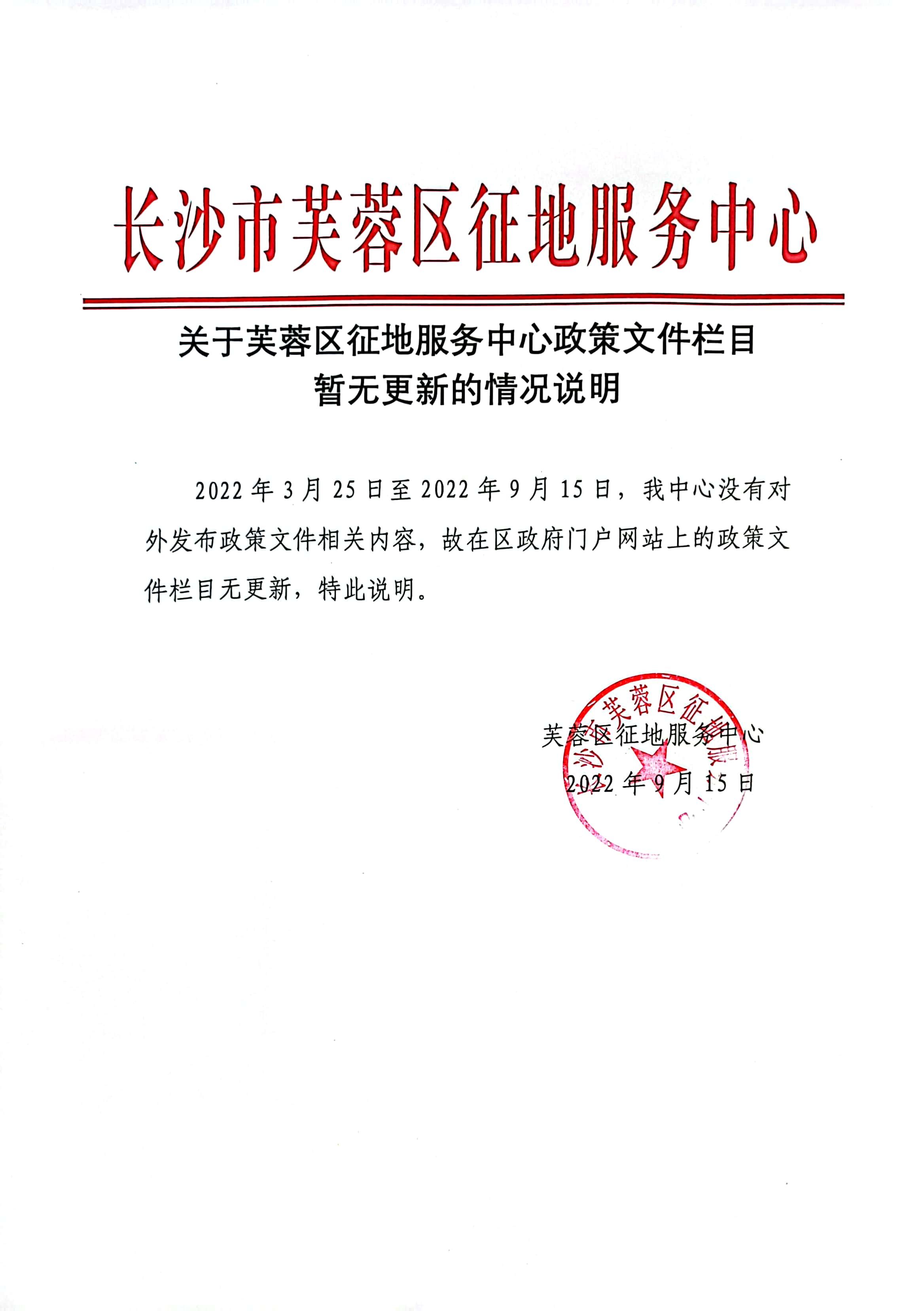 关于芙蓉区征地服务中心政策文件栏目暂无更新的情况说明