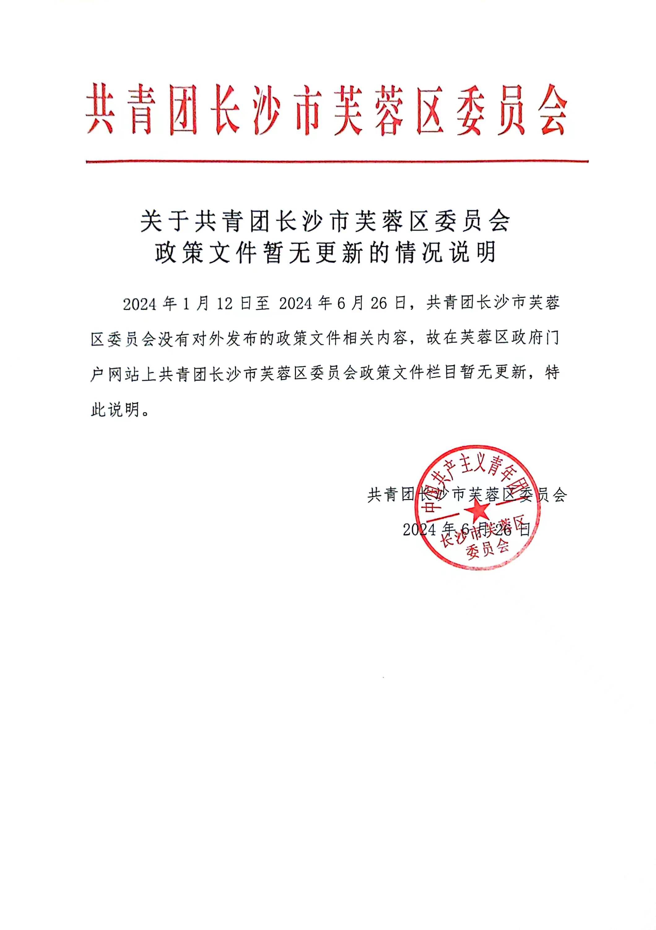 关于共青团长沙市芙蓉区委员会政策文件暂无更新的情况说明
