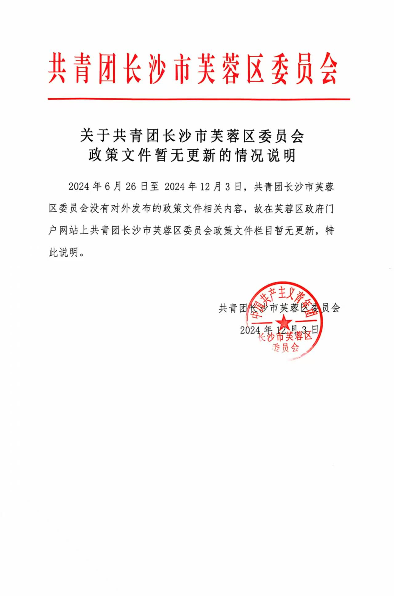 关于共青团长沙市芙蓉区委员会政策文件暂无更新的情况说明