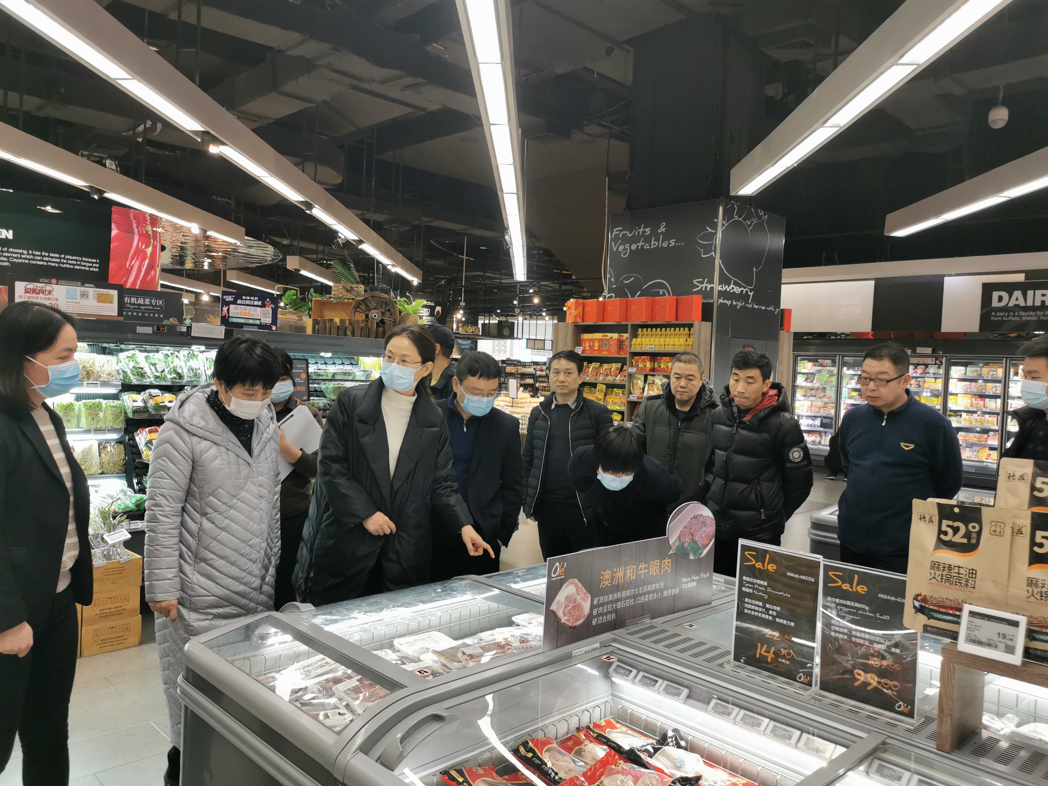 20201127日,芙蓉区龙8国际副区长梁汝岚调研国金ole超市冷链进口食品疫情防控安全工作,芙蓉区市场监管局副局长刘正军,区市监管局食品药品监管科科张国林,区疾控中心主任张运秋等人员陪同调研。