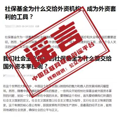 近段时间以来,有少数网络自媒体发布信息称,我国社会保险基金“几乎全部交给外资机构管理”,且被用于“买卖A股”,质疑社保基金成为“外资套利的工具”。经中国互联网联合辟谣平台向有关主管部门核实查证,前述言论均为不实信息。