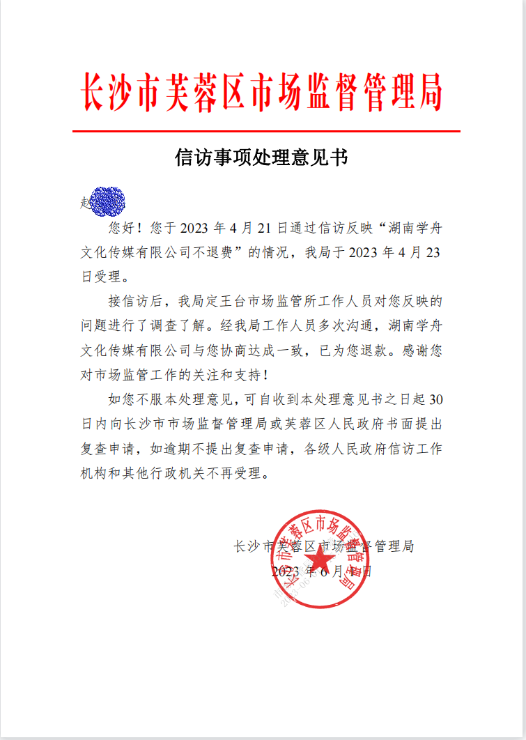 反映要求湖南学舟文化传媒有限公司退款问题 |