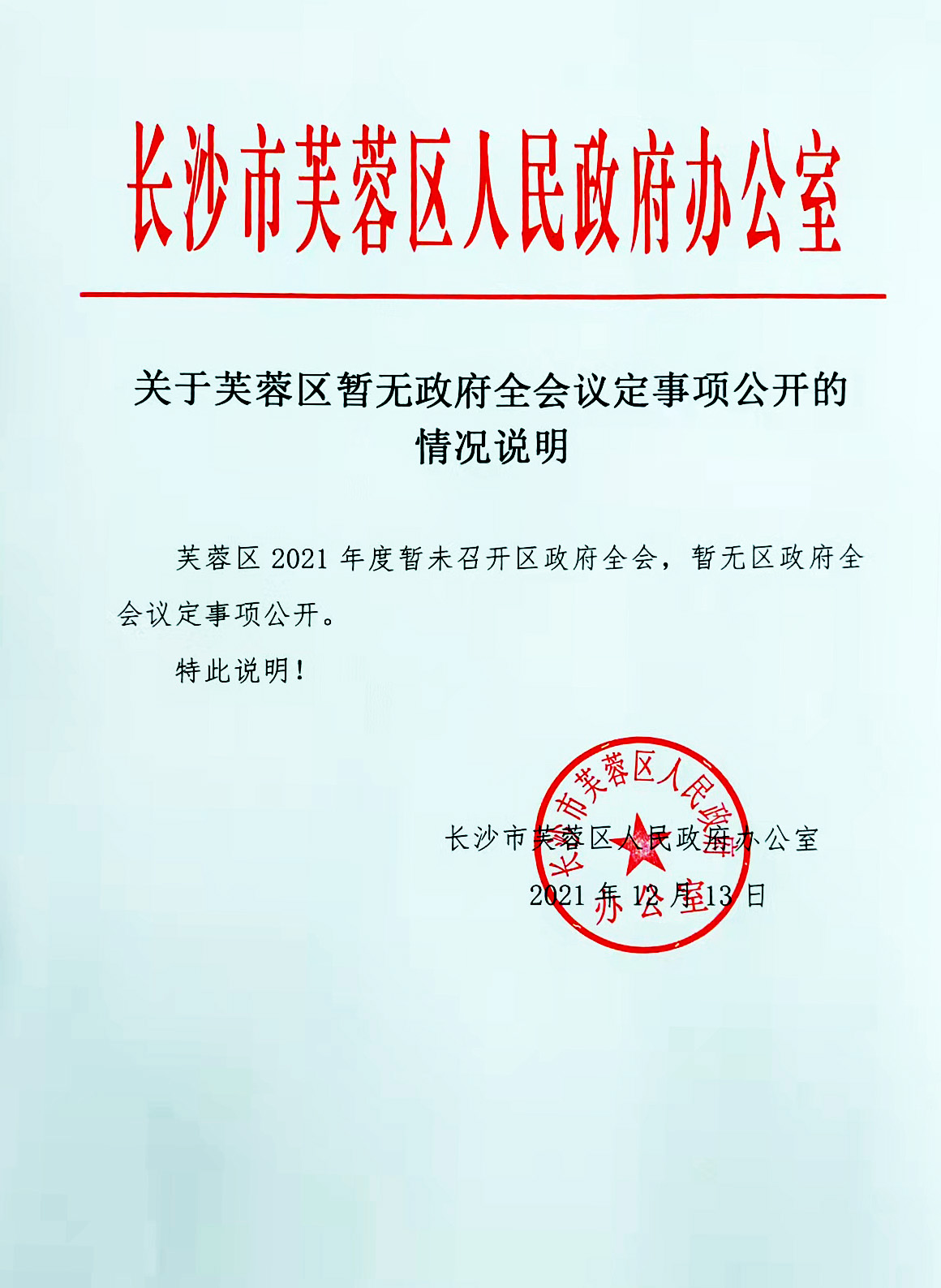【情况说明】关于芙蓉区政府暂无政府全会议定事项公开的情况说明