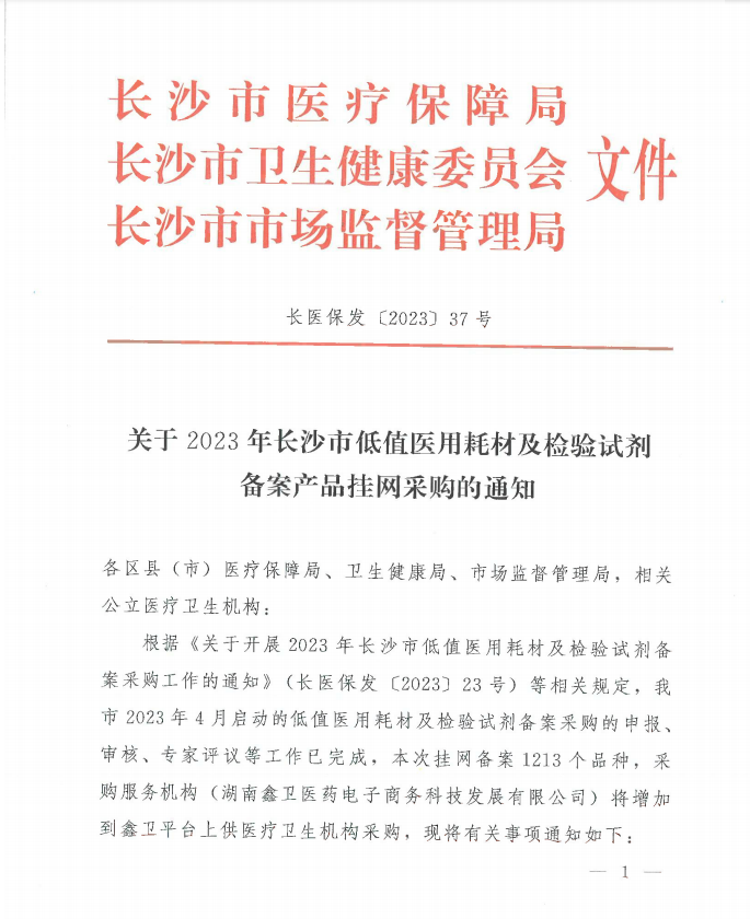 关于2023年长沙市低值医用耗材及检验试剂备案产品挂网采购的通知