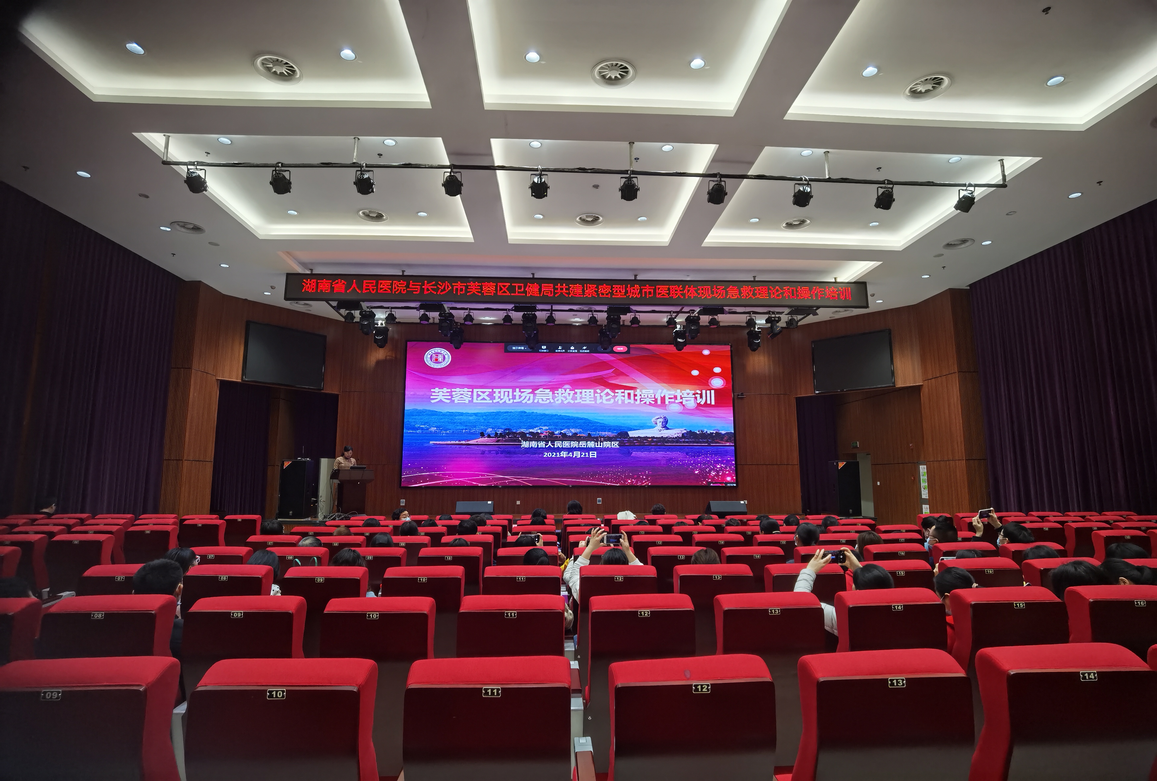 2021年4月21日,长沙市芙蓉区卫生健康局与湖南省人民医院共建紧密型医联体现场急救理论与操作培训在湖南省人民医院岳麓山院区顺利举行。此次培训采取线下内容线上同步直播的培训形式,参训人员来自芙蓉区各新冠疫苗接种单位负责医疗保障的医务人员和辖区内其他医疗机构的医护人员。