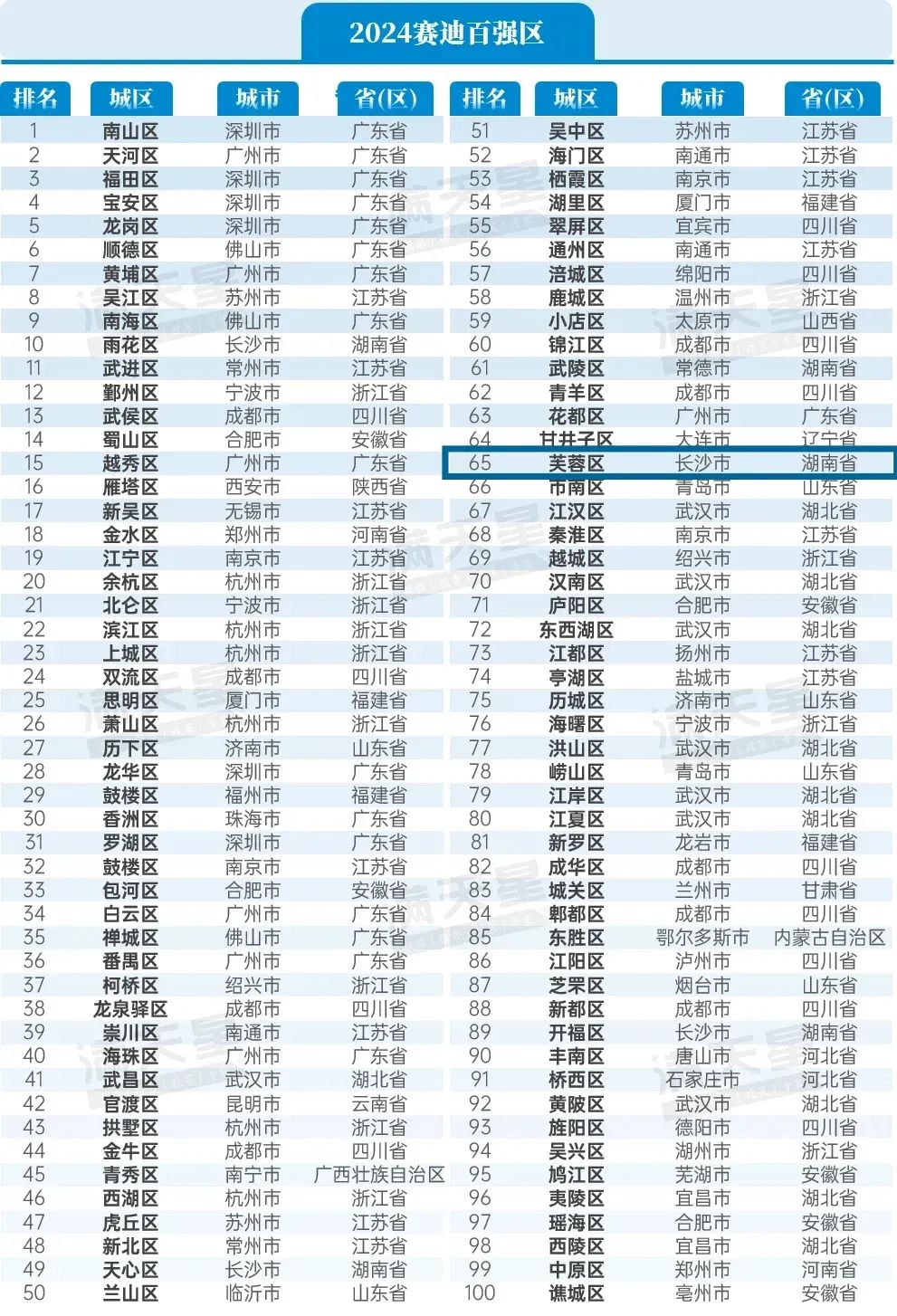 2024年8月2日,赛迪顾问城市经济研究中心发布“2024赛迪百强区”榜单,芙蓉区在赛迪百强区中位列65位,较上一年上升3位。芙蓉区近四年来连续入选“赛迪百强区”榜单,排名逐年上升,四年攀升27位。